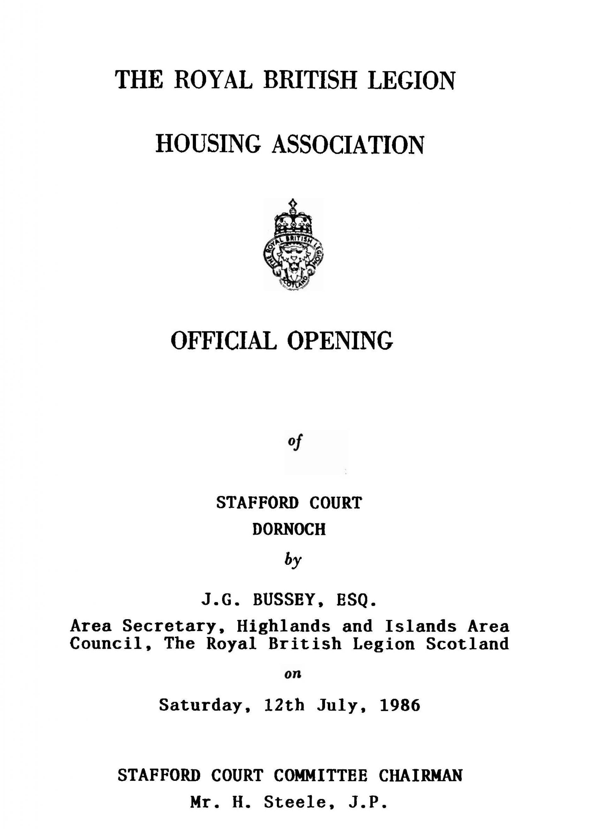 Copy of the Programme for Official Opening of Stafford Court Dornoch by J G Bussey, Area Secretary, Highlands and Islands Area Council, The Royal British Legion Scotland on Saturday 12th July 1986