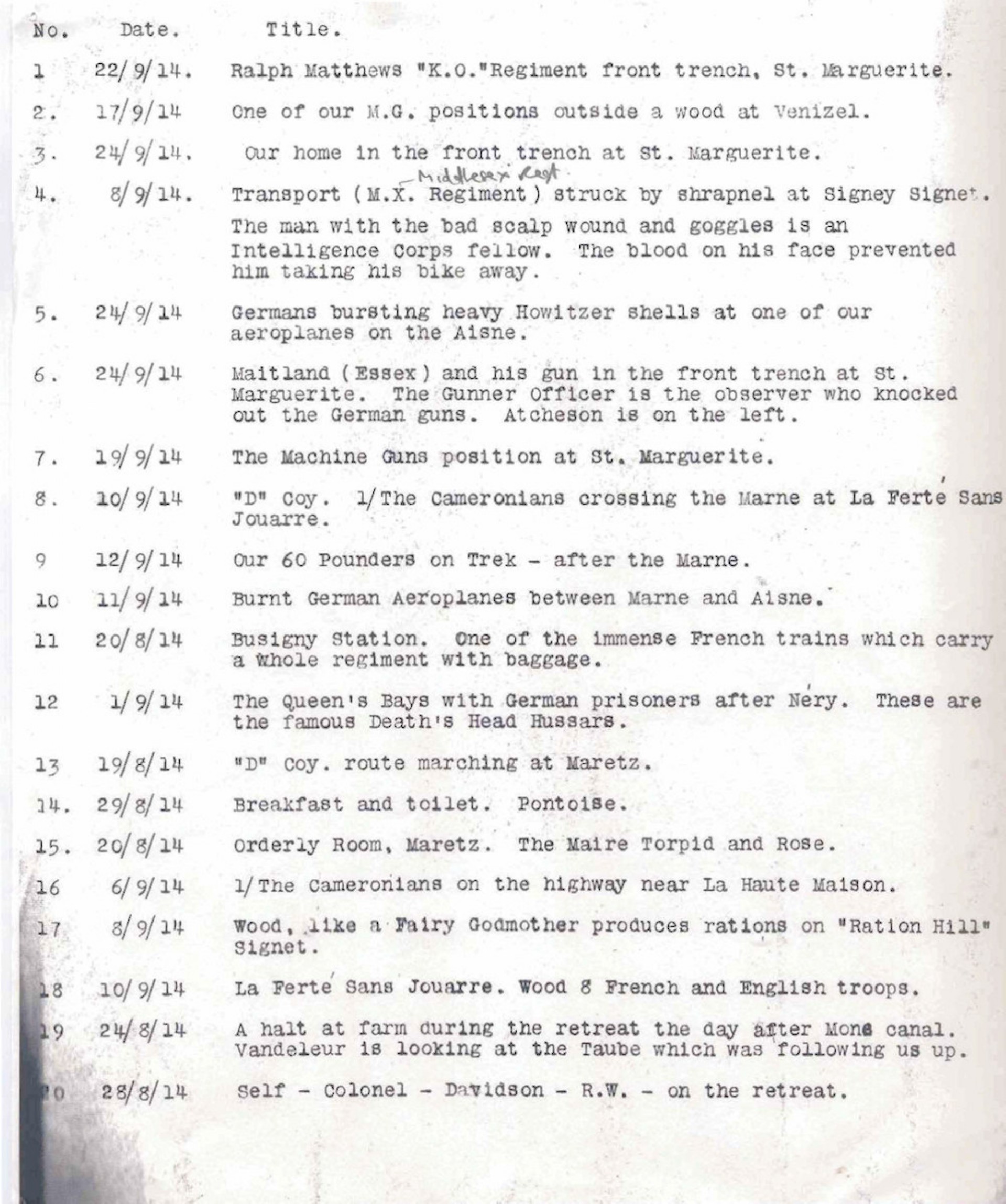 Captain Rose photograph album typewritten list of captions with dates Aug/Sep 1914