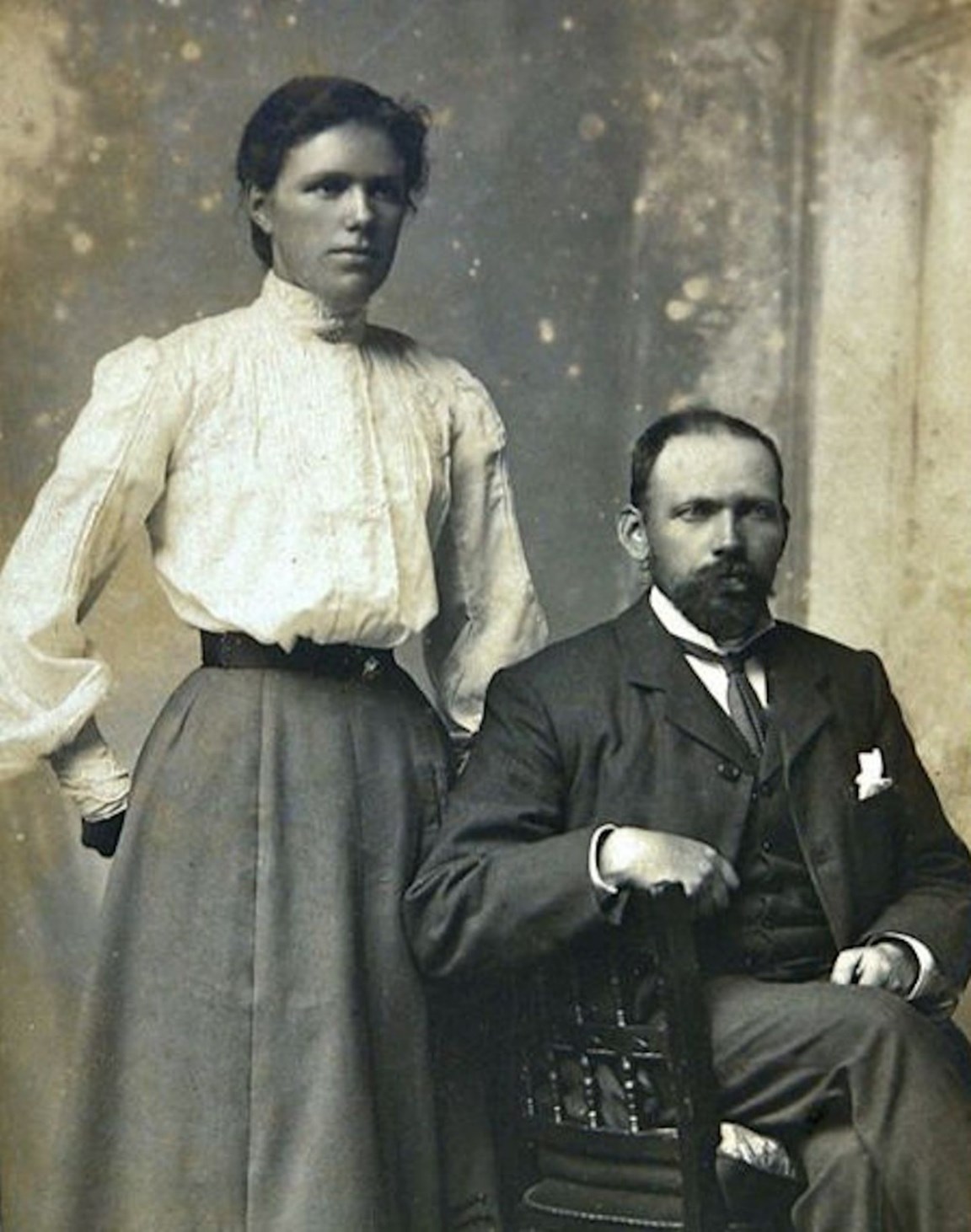 Monochrome photograph of Margaret Sutherland of Hillview, Rearquhar and William Murray of Achatomlimi, Nr Langwell, Rogart. After their marriage, they lived in Gilbert Street, Dornoch. William was a carpenter and the couple left Dornoch so that he could help build missions in Cape Province, South Africa where they later became missionaries themselves.