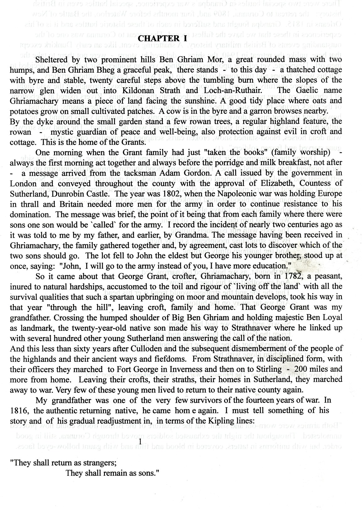 It opens with the tale of George Grant born in 1782 who joined the army in lieu of his elder brother (because he was better educated) following the call from the Countess of Sutherland for one son from each family to fight in the Napoleonic War. George went on to survive the wars and returned home in 1816.