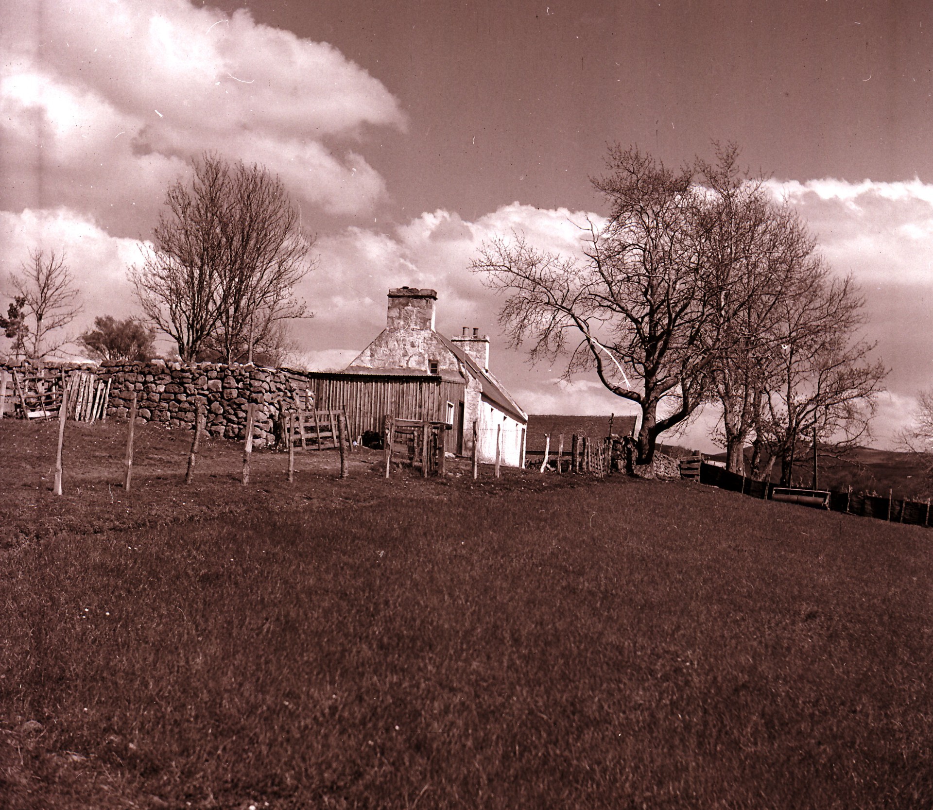 Monochrome negative in glassite sleeve from a collection belonging to Miss Lyon showing a scenic view of a croft house.