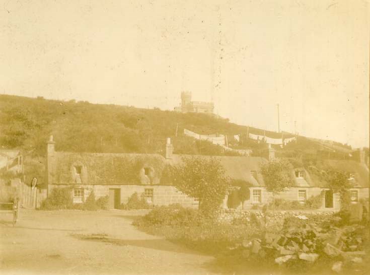 An early monochrome photograph of houses in St Gilbert Street, Dornoch. From page 15 of an album of postcards and photographs, taken by Mrs J.I.C. Mackay, of Dornoch and surrounding area.
