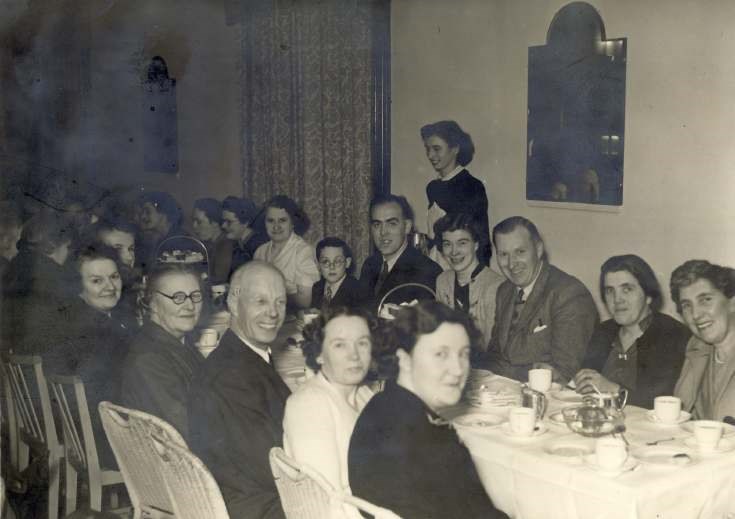 Monochrome photograph of a tea party in Clashmore Hall 1953. Back row left to right: Jenny Mackay, Donald Mackay, Bill Rugg, Jesse Steven, 'Steven' gardner at Skibo, Angie Gordon (Clashmugach), Mrs Gimy Bain (Littletown). Front row left to right: Mrs E Oakfield (Mackay House), Mrs Ross (Marcus Cottage, Clashmore), Willie Calder (Skibo), Mrs Leckenby, unkown.