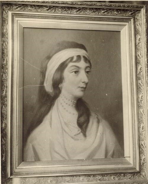 Black & white photograph of portrait, possibly of Georgina Anderson. Long explanation on the back (by Miss Lyon?) gives connection with William Munro of Achany (she was one of his 11 children) and the wife of Dr Grant, minister of Dornoch. Also mentions that Munro of Achany crest is on fountain in front of cathedral - this was given to the town by Georgina Anderson.