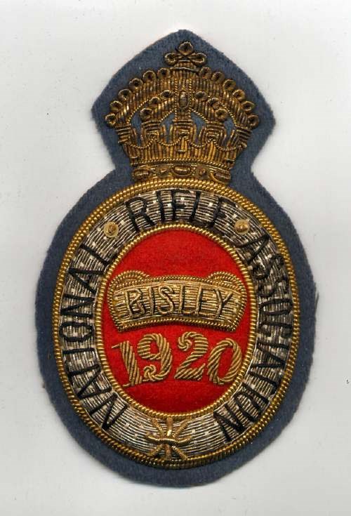 Embroidered raised badge in the shape of an oval with crown above, on a backing of blue felt, hessian or similar, and paper. The borders of the oval and crown are worked in metal thread with sequins. The words NATIONAL RIFLE ASSOCIATION are embroidered in black round the border, and BISLEY 1920 is worked in metal thread on a red felt background in the centre.