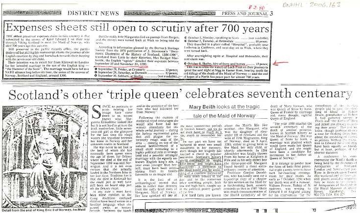 Photocopy of an extract from the Press and Journal of 8th February 1990, with an article 'Scotland's other 'triple queen' celebrates seventh centenary' plus an account 'Expenses sheets still open to scrutiny after 700 years' about the expenses incurred by the son of King Edward I at Skelbo and Dornoch.