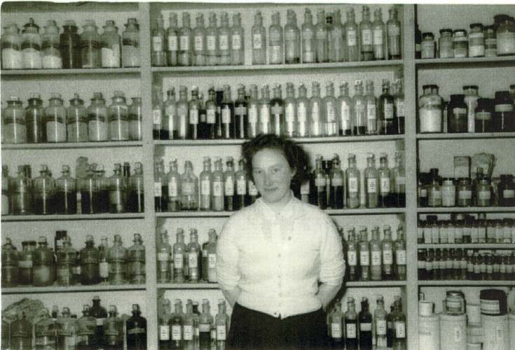 Photocopy of a monochrome photograph of Marie MacAskell (Masson) at the time of her leaving Wickhams Chemist shop to get married. On retirement, the couple eventually left Dornoch to live in Thurso.
