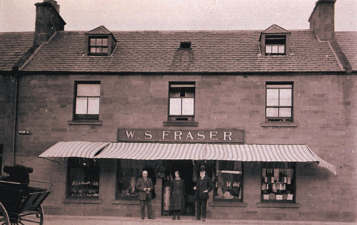 Negatives sheet 4A 27 to 32 Strip 2 (contact prints 1A2/Row 1) 27 Two men, either side of a lady, standing outside the entrance to W S Fraser's shop in Dornoch High Street (see also picture #1425) 28 is a duplicate of this photograph. 29 is a sepia photograph of a group of councillors with the Provost in regalia (see also picture #9355). 30 is a duplicate of this photograph. 31 is a landscape photograph of a large group of men outside an hotel which can be used using the pdf link below. 32 is a duplicate of this photograph.