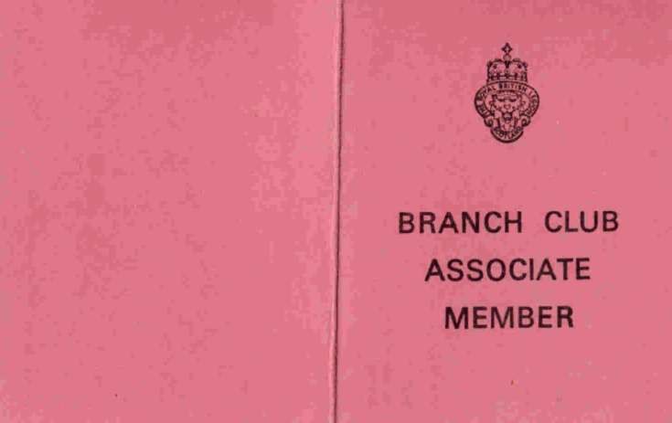 Small pink folded card with Royal British Legion badge and title 'Branch Club Associate Member' The reverse includes spaces for member's details, Register number and signatures of Member and Branch Club Secretary/Treasurer. [The linked pdf shows the reverse detail.]