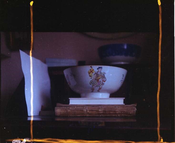 First of three photographs from a colour negative of a porcelain bowl displayed on a shelf. This series of negatives from the Miss Lyon collection have line annotation indicating that she was conducting trial exposures with proposed areas for enlargement to achieve a desired print.