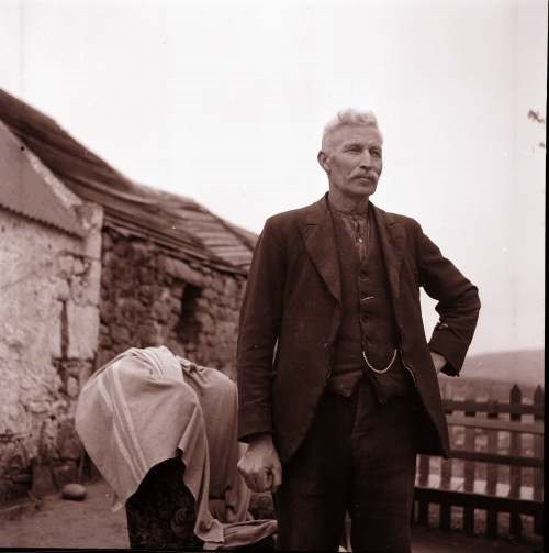 A monochrome negative of a photograph of Hector Calder at his croft. From Miss Lyon's collection.