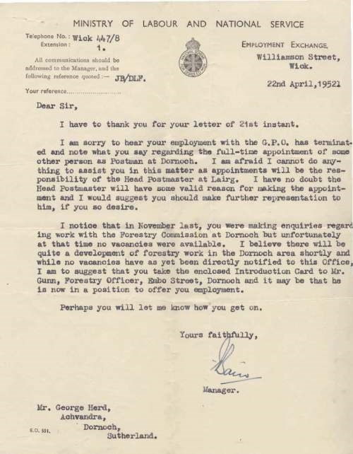 Correspondence to and from the Dornoch Branch Royal British Legion, concerning: invalid chairs, visits to War Graves in Holland, work for the disabled, provision of a small car, mechanical chair for Robert Watson of Skelbo