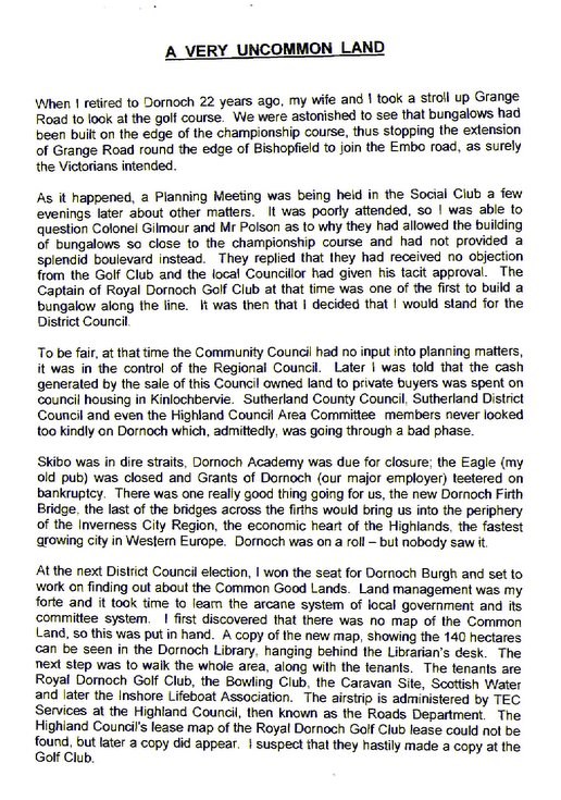 Copy of a three page typewritten letter by Duncan Allan, with the title 'A Very Uncommon Land', published in the Northern Times September 2011 about the history of the common good lands, including the relationship between the Dornoch Burgh and the Royal Dornoch Golf Club.