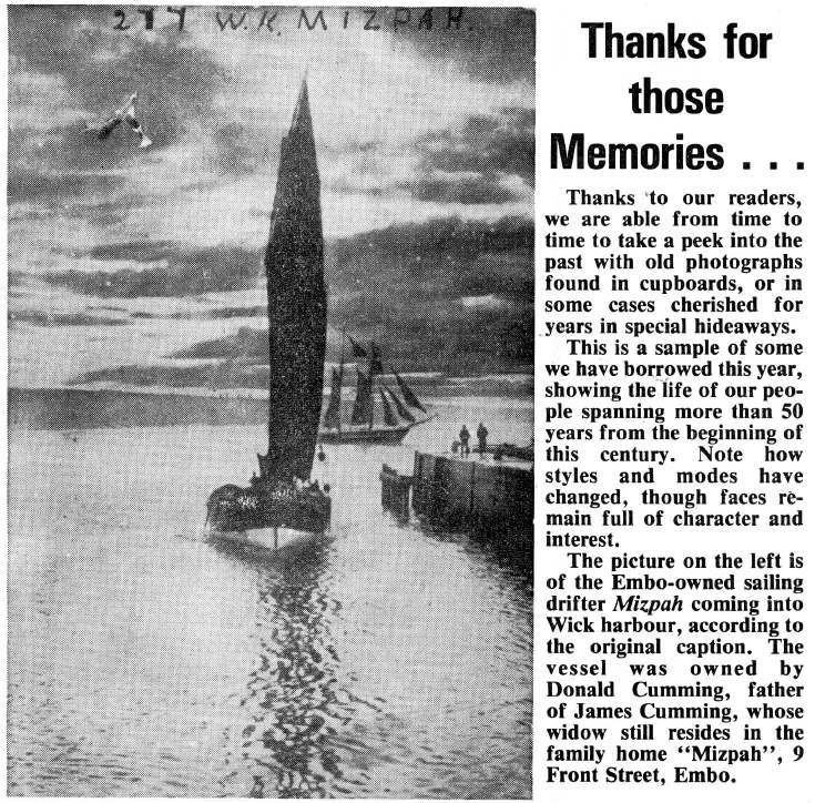 Cutting from the Northern Times with three photographs related to Embo lent to the paper by Morag Macdonald, daughter of Janet Grant Cumming. The first shows the Embo drifter Mizpah sailing into Wick Harbour. It has the caption 277 WK MIZPAH at the top. The boat was owned by Donald Cumming, father of James Cumming, whose widow was still living at Mizpah, Front Street, Embo at the time of the article (date unknown).