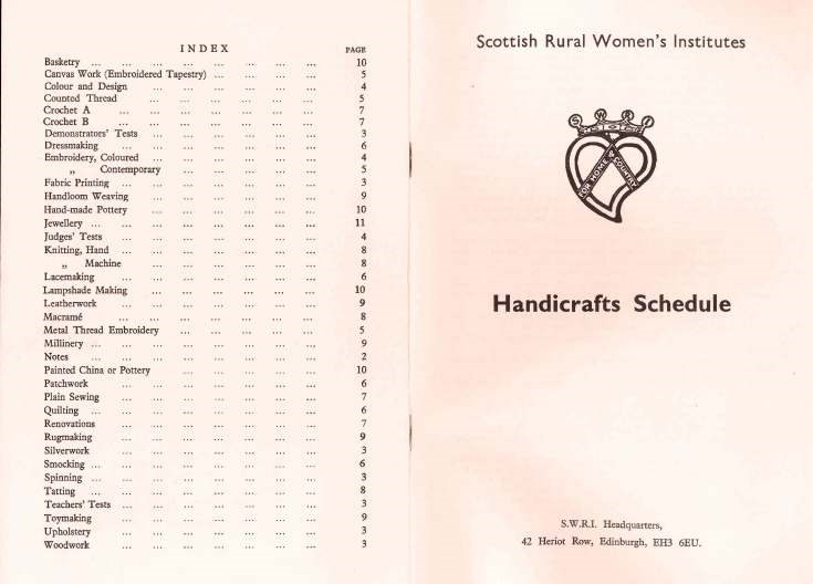 Copy of Scottish Women's Rural Institutes pamphlet covering the Handicrafts Schedule. The pink card cover has a central badge of the SWRI. The eleven page document covers demonstrators', teachers' and judges' tests and handicraft standards ranging from colour and design, the number of articles to be submitted and the points for judging. There is a Amendment sheet insert dated May 1980 and a copy of the form to be used by candidates for handicraft tests