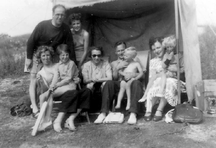 Set of monochrome photographs of two families from Glasgow, staying in the first caravans seen in Dornoch, including views of the beach and children diving off the 'big rock'. The photograph of the two families is dated July 1953, with beach photographs thought to be earlier 1945-46. (The set of photographs, with annotation providing names can be viewed on the linked pdf file.)