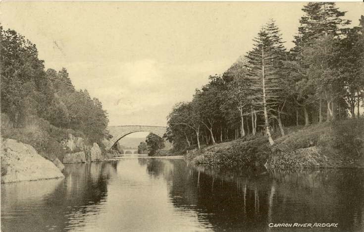 Monochrome postcard from the Furness Collection with a distant view of Carron Bridge from the 'Carron River, Ardgay'. The reverse has a green Edward VII halfpenny stamp with Ardgay Postmark Sp 20 1910 and an address in Kent. (The stamp was affixed upside-down)
