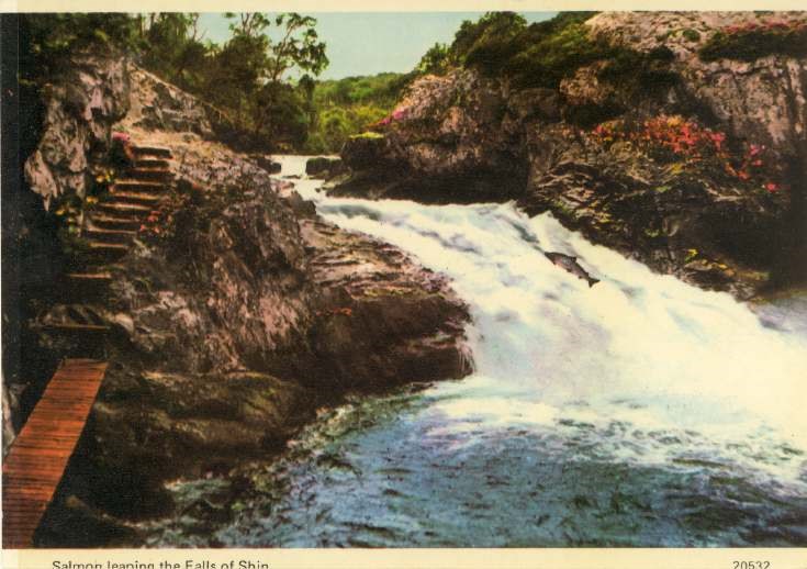 Colour postcard from the Furness Collection showing a salmon leaping the Falls of Shin with a board walk and steps over the rocks to the left of the photograph