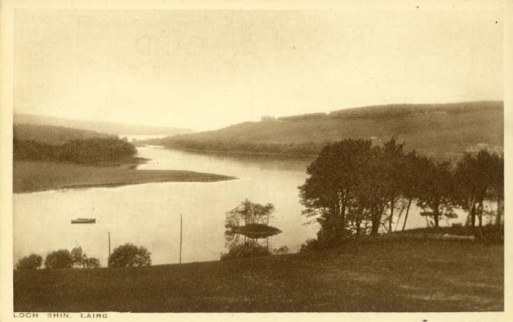 Monochrome postcard from the Furness Collection with a misty view of Loch Shin. .