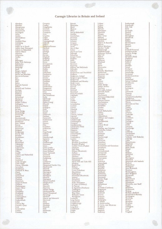 Carnegie Libraries in Britain and Ireland from a set of 21 posters of the life of Andrew Carnegie published on the 150th anniversary of his birth. A3 size.