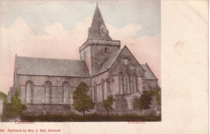 Tinted postcard, from the Basil Hellier collection, showing Dornoch Cathedral from the south side, with red lettering at the foot "Cathedral Dornoch ~ 367 Published by Mrs. J. Bell, Dornoch".