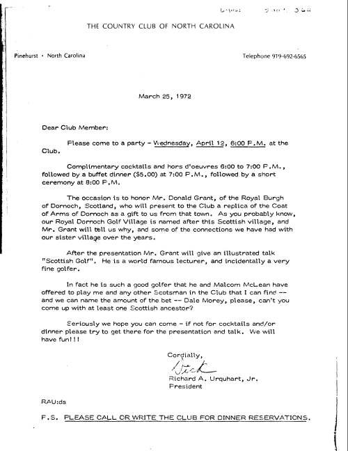 Photocopy of an invitation from Richard Urquhart, President of the Country Club of North Carolina to a party to honour Donald Grant.