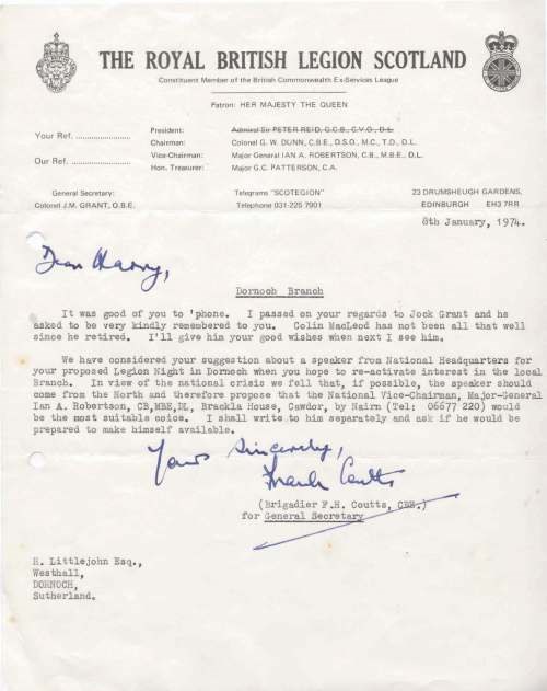 British Legion Dornoch Branch correspondence Jan - Feb 74 concerning a visit to the Dornoch Branch by the National Vice-Chairman Major General Ian A Robertson CB, MBE, DL. The purpose of the visit was to reactivate local interest and the selection of the visiting officer 'from the North' was considered most appropriate given 'the national crisis' (the 'Winter of Discontent' 1973 - 74 when there were strikes and rota power cuts).