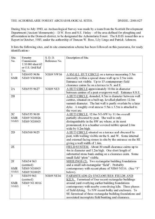 List of archaeological sites in Achormlarie Forest, with grid references and short descriptions of each, extracted from document produced by Scottish Development Dept., 1983. 5 pages clipped into plastic spine.