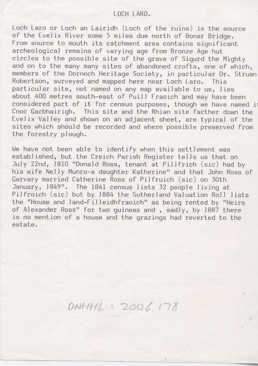 A3 photocopies of two 6 inch to 1 mile maps dated 1907 and 1874 showing the changes that had taken place in settlement in the Loch Laro area (source of the Evelix River), plus a sketch of a grain drying kiln. Further A4 photocopy of a description of the site by G J Douglas and Jane Durham, dated 1986-7. Photocopy of an A5 page typed 'record card' for the site with an accompanying letter on headed paper 'The Royal Commission on the Ancient and Historical Monuments of Scotland' dated 2:11:1988, to Jimmy Bell signed by Graham Douglas