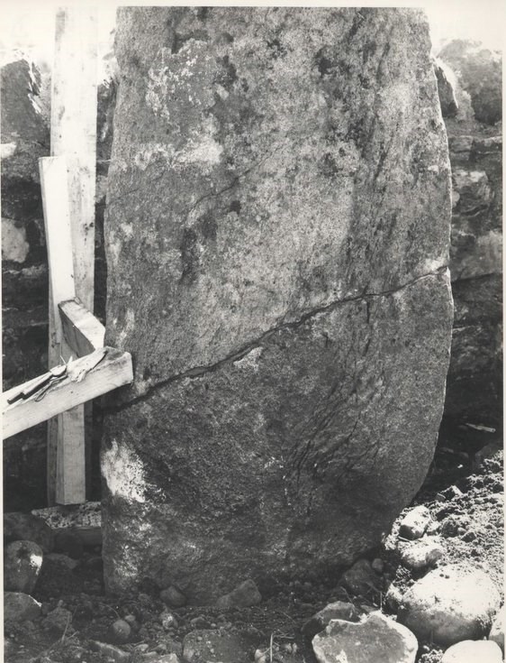 Monochrome photograph of detail of the base of the re-sited Clach a'Charra in 1968.