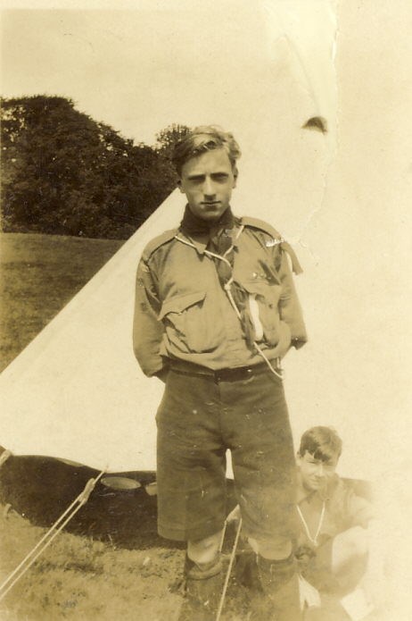 Monochrome photograph in a series of 19 of a Patrol Second (single white stripe on shirt pocket) at camp standing in front of a bell tent. The previous image shows this scout in civilian clothes with annotation "RAF 1940"scout with the next previous image showing him as as a boy. One of a package of photographs contained in an old Kodak envelope marked "Troop Leader H Leslie. One set of last camp for Troop Log. Remainder to be distributed democratically!! Sorry that there aren't more. Cheerio Baloo".