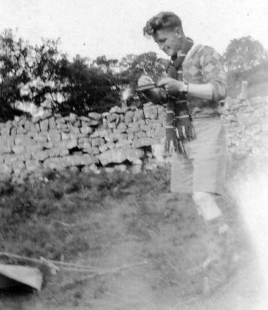 Monochrome photograph in a series of 19 of a scout wearing a striped woollen scarf. One of a package of photographs contained in an old Kodak envelope marked "Troop Leader H Leslie. One set of last camp for Troop Log. Remainder to be distributed democratically!! Sorry that there aren't more. Cheerio Baloo". Some of the photographs look as if they have been torn from the brown sheets with the bulk of scout photographs