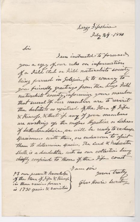Letter from Elias Houre(?) secretary of the Largo Field Naturalists' Society dated 24 Feb 1880, enclosing a copy of their rules and expressing interest in an exchange of information on mosses and lichens. Single sheet.