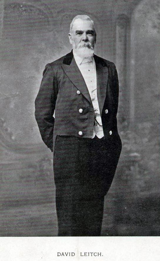 Monochrome photograph of white-bearded man in evening dress with printed caption "David Leitch". May be connected with Largo Field Naturalists' Society as it was with the rules and is about the same size.