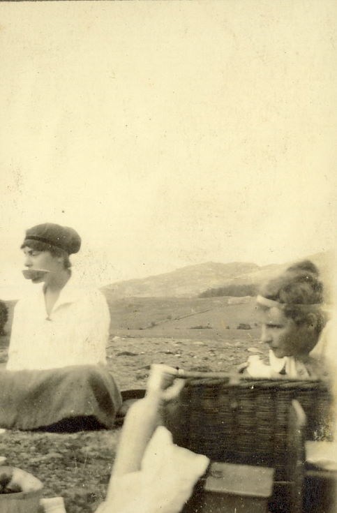Monochrome photograph on page 4 of the '1950 Album' of Mr Hardie, Factor of Skibo, taken on a picnic with a lady with a large piece of food in her mouth. On the reverse is the inscription handwritten in black ink "Always the perfect lady".