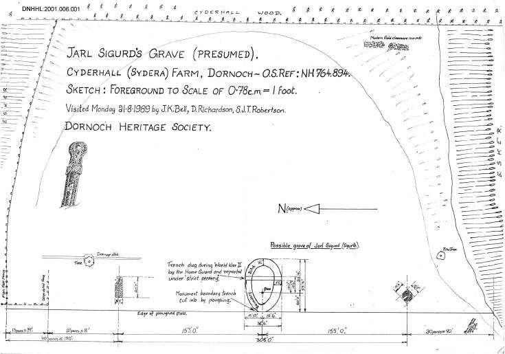 Collection of plans and photographs of Cyderhall (Sydera)Jarl Sigurd's presumed grave. This plan shows the assumed location and layout of the Viking Jarl Sigurd's grave, with relevant dimensions.