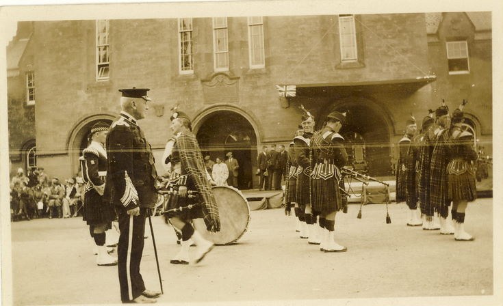 Monochrome photograph Donoch Pipe Band on parade in The Square, Dornoch
