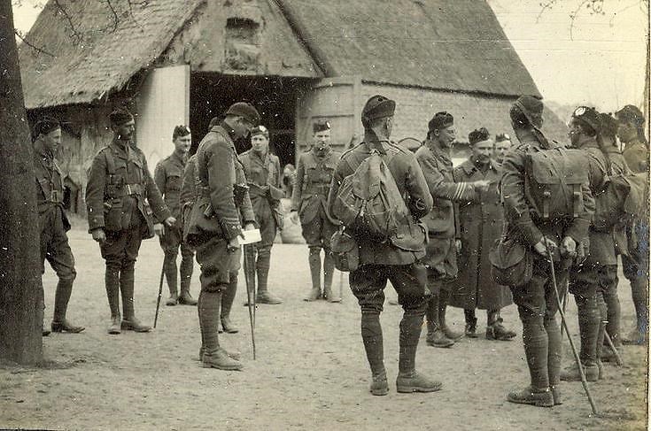 Monochrome photograph, © South Lanarkshire Council Museums Service, from an album compiled by Lieutenant Robert Cotton Money (see 2008.143), no inscription, Col. Vandaleur is introduced to his officers 27/04/15. (Lt Col Crofton Bury Vandeleur, Cameronians, prior to promotion Second-in-Command 1st Battalion Cameronians)