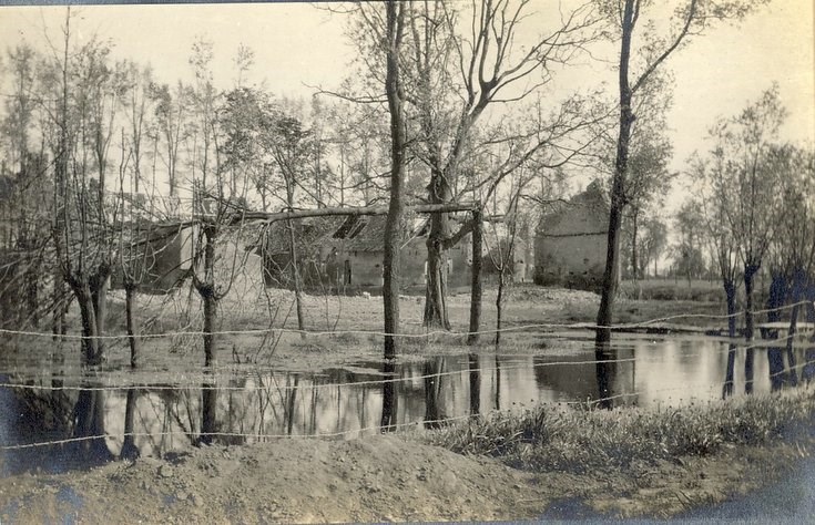 Monochrome photograph, © South Lanarkshire Council Museums Service, from an album compiled by Lieutenant Robert Cotton Money (see 2008.144), with photographs from various sources, with inscription: 'Flamenderie Farm from reserve trench'.