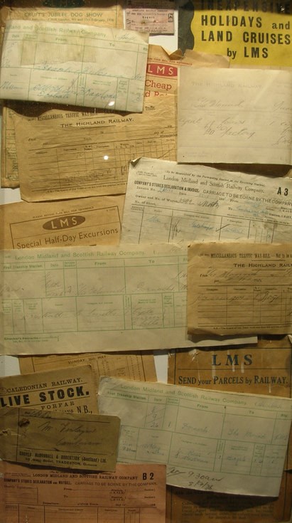 Glass fronted notice board with white painted wooden frame, containing original tickets, adverts, waybills etc mostly relating to the Highland Railway. The front of the notice board opens on hinges and is secured by two small hooks. The papers inside have been pasted both to each other and to the back of the board. Some of the papers are faded. The wooden surround is dirty and chipped.