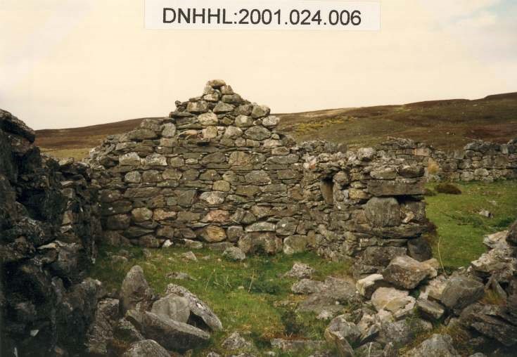 Colour photo of Srath Ach a' Bhathaich (Allt Snipeag and Strathan) - outbuilding at Tom Tosh's house. Mounted on a board with 9 other photos (numbered separately). A more general view of the outhouse, or dwelling, showing full formed gabled end, small sized window and door.