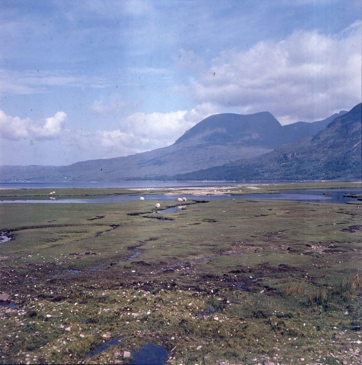 Colour negative, in glassite sleeve, taken from a collection belonging to Miss Lyon (most labelled in her handwriting), showing sheep grazing on land beside a firth.