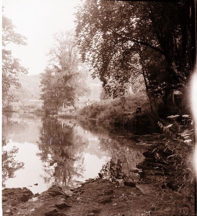 Monochrome negative, in glassite sleeve, taken from a collection belonging to Miss Lyon (labelled in her handwriting) "Pool at Pont Cysyllite, 1st lot no figure and still reflection" (? white blob appears to right of tree in the pool and on the bank above)