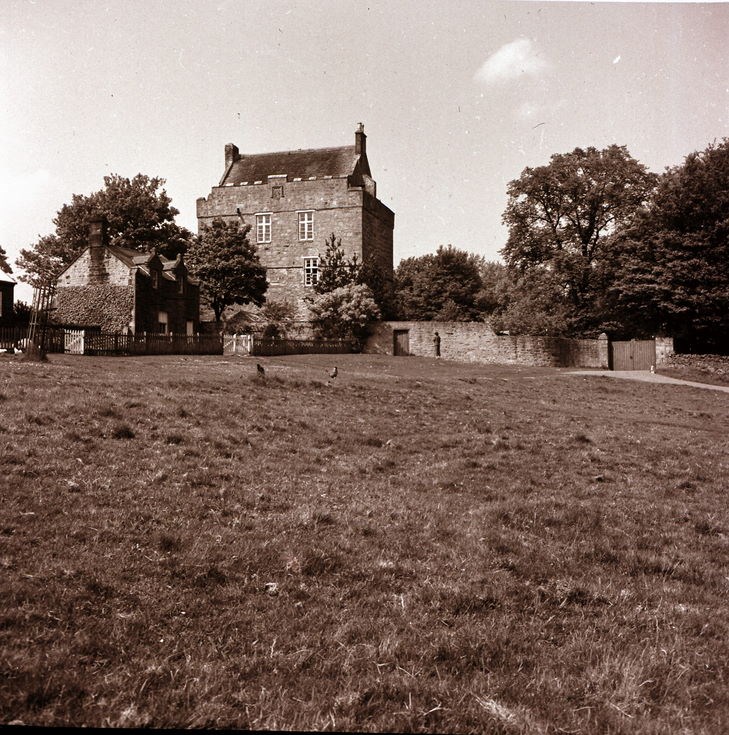 Monochrome negative, in glassite sleeve, taken from a collection belonging to Miss Lyon labelled in her handwriting 'Outside of large house / farm'.