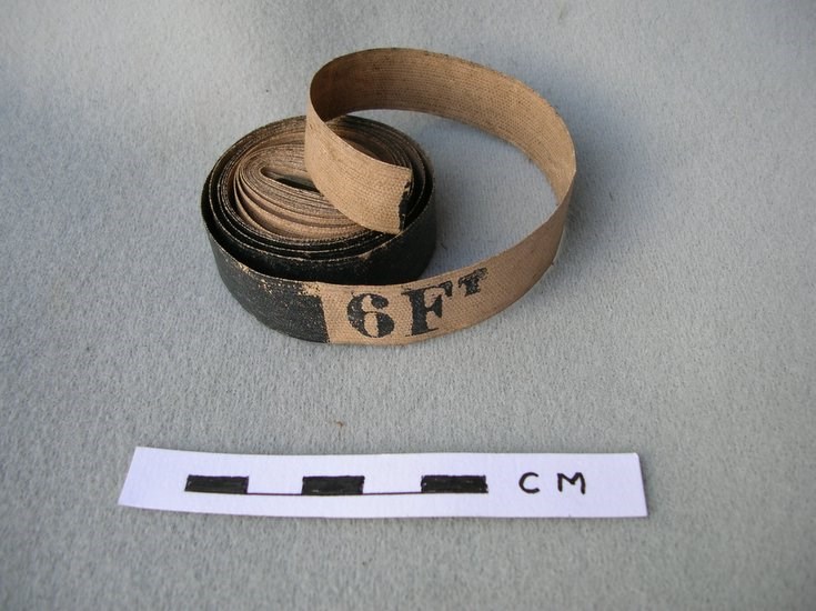 Tape measure inscribed "GPO", maker: "Chesterman's Patent Constantia tape, Sheffield 8"; marked at 3ft 6in and 6 ft. Tape is buff coloured linen, with one brass end; total length 6' 6". For measuring parcels?