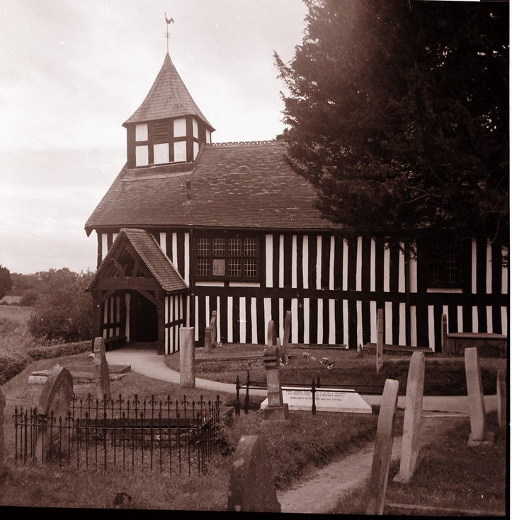 Monochrome negative, in glassite sleeve, taken from a collection belonging to Miss Lyon (most labelled in her handwriting), showing a view of the church and churchyard at Melverley.