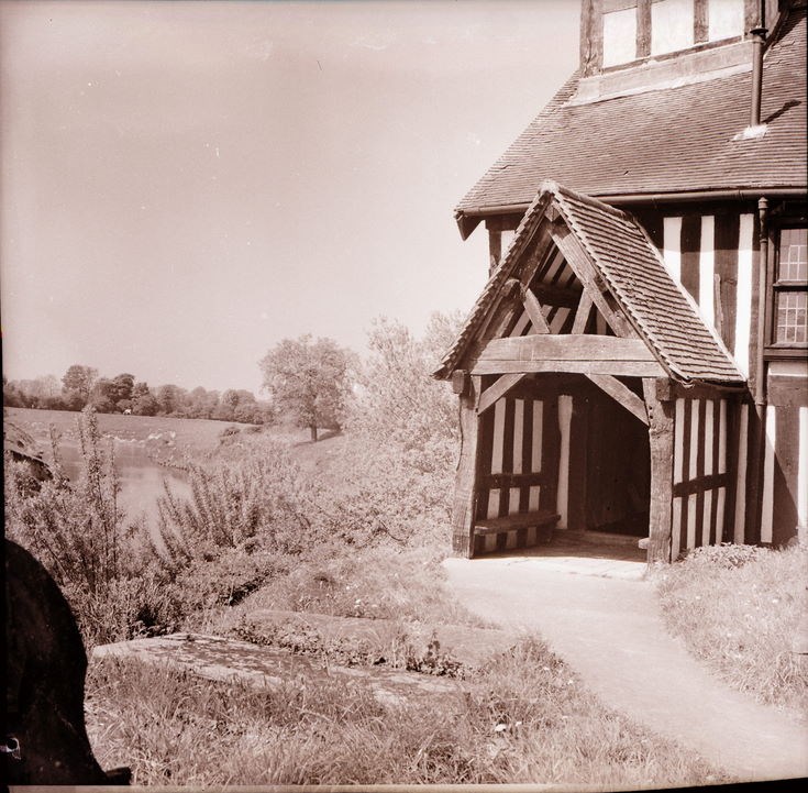 Monochrome negative, in glassite sleeve, taken from a collection belonging to Miss Lyon labelled in her handwriting "Melverley". This view shows the entrance to the church and at mid-point left a glimpse of river on which it stands.