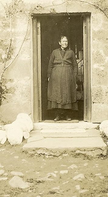 Photograph shows Jemima Mackay (nee Forbes), the wife of William Mackay, at the front door of the croft house.