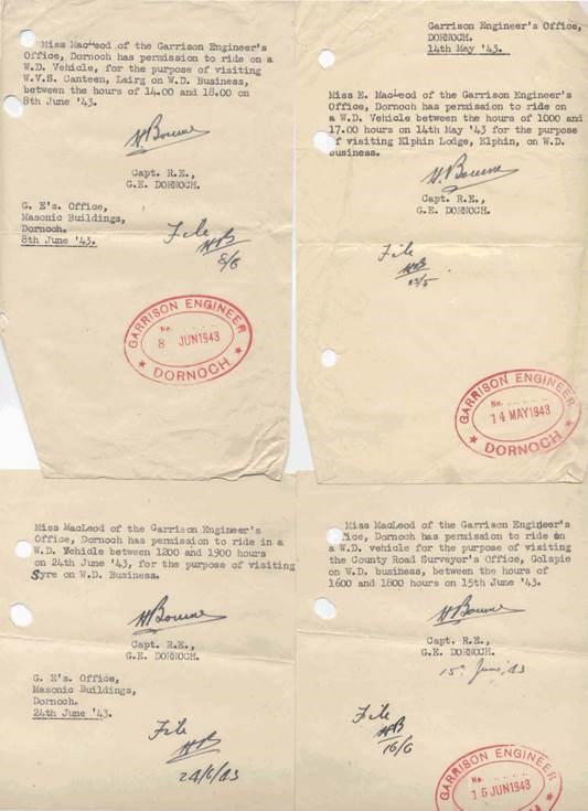 Set of ten travel permits for Miss Elisa MacLeod covering the period May to July 1943 allowing to travel on a War Department vehicle on various local journeys