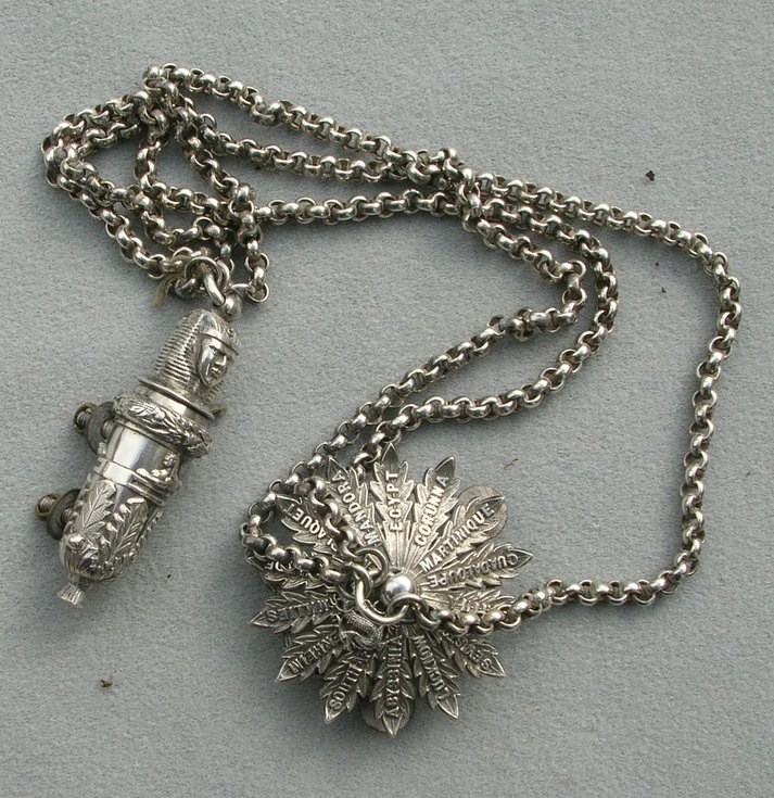 Silver accountrement from the Cameronians uniform cross belt belonging to Capt Rose . The star shaped fixing was positioned towards the shoulder with the chain looping down to the decorated whistle positioned towards the waistline. (see cross belt in portrait of Capt Rose picture #6822). The star shape bears 'rays' with the titles of Cameronians battle honours and has three screw attachments on the outer edge. The diameter of the star is 63mm. The decorated whistle has a double pharoahs head, with a Sphinx on the whistle holder, appropriate for the Egypt regimental battle honour. There is a catch on the whistle to release from the holder and on the rear two screw attachments. The whistle in its holder is 75mm long and 25mm diameter. There is a triple chain linking the star and whistle 380 mm in length. One of the chains has a broken link at the whistle end.